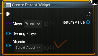 이제 Object가 생겼으니, 이 Object를 Reference로 받을 수 있게 됩니다. 똑같이 Create Widget을 해주고 Class를 Parent 설정하면, Objects라는 변수명이 노출 된 것을 알 수 있습니다. 이는 변수 명 설정에서